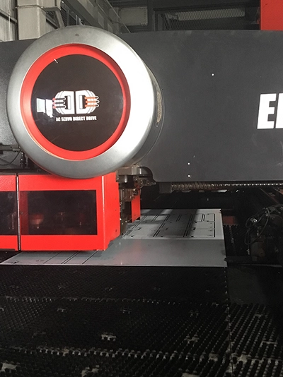 材料棚から適正な材料を自動でブランク工程へ供給。パンチングマシンやベンディングマシンによる金属板の裁断、穴あけ加工、曲げ加工をおこない効率よく生産しています。