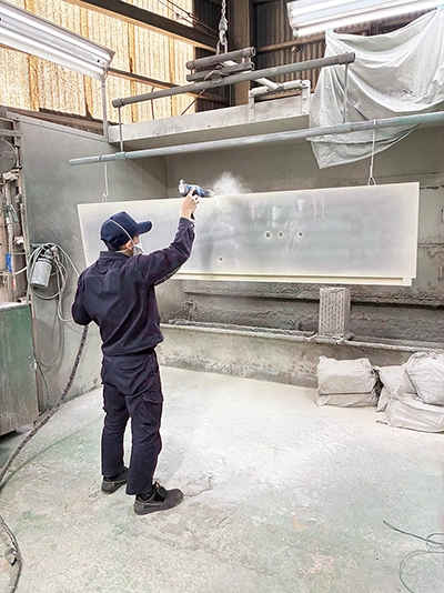前処理として脱脂処理、表面処理をおこない、エポキシ・ポリエステル樹脂粉体塗料にて静電塗装します。塗りムラの少ない、美しい外観へと仕上げます。