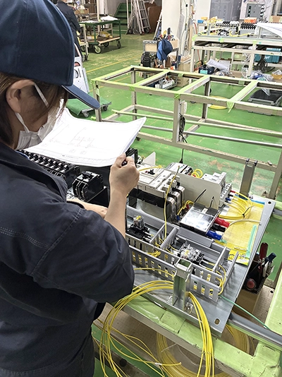 塗装完了した盤筐体に機器を取り付け、配線図をもとに機器の配線をおこないます。主に、主回路,制御回路配線作業があります。納品した部品の仕分け、整理作業もおこないます。