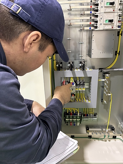 組立後の盤に外観検査,部品配線検査,絶縁抵抗検査,耐圧試験,動作試験を実施します。盤の寸法や機器の配線に誤りが無いか、シーケンス図通りに動作するかなど、細かくチェックしていきます。